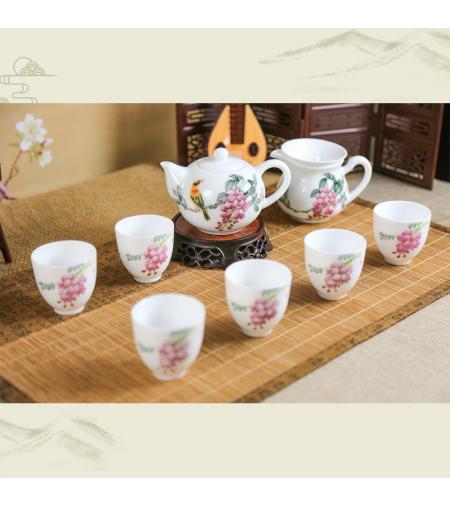 [品名]:《锦绣前程》 [品牌]:大球泥瓷 [货号]:DQN-CJ230016 [材质]:大球泥 [工艺]:高温釉下 [规格]:9头 [作者]:张江华(高级工艺美术师) [产地]:中国醴陵 [价格]:55000.00元