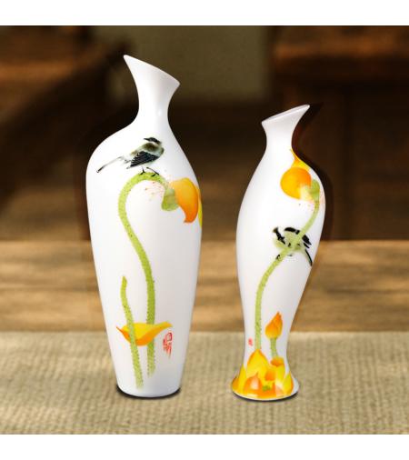 [品名]:《天作之和》对眸瓶 [品牌]:大球泥瓷艺 [货号]:DQl-P250007 [材质]:大球泥 [工艺]:高温釉下 [规格]:高26cm;肚径9cm 高25cm;肚径7cm [作者]:张江华(高级工艺美术师) [产地]:醴陵 [价格]:96000.00元