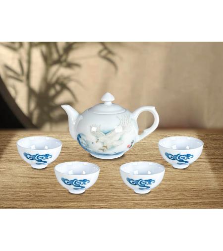 [品牌]:大球泥瓷 [工艺]:高温釉下 [规格]:5头 [产地]:中国醴陵 [价格]:35000 [作者]:易刚丽(湖南省陶瓷工艺大师) [材质]:大球泥 [货号]:DQN-CJ240011 [品名]:《乘风破浪》一壶四杯