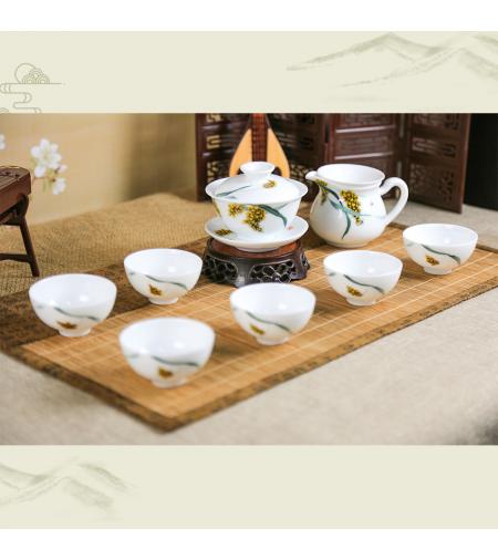 [品名]:《岁物丰成》功夫茶具 [品牌]:大球泥瓷 [货号]:DQN-CJ200006 [材质]:大球泥 [工艺]:高温釉下 [规格]:11头 [作者]:易刚丽(湖南省陶瓷工艺大师) [产地]:中国醴陵 [价格]:84000.00元