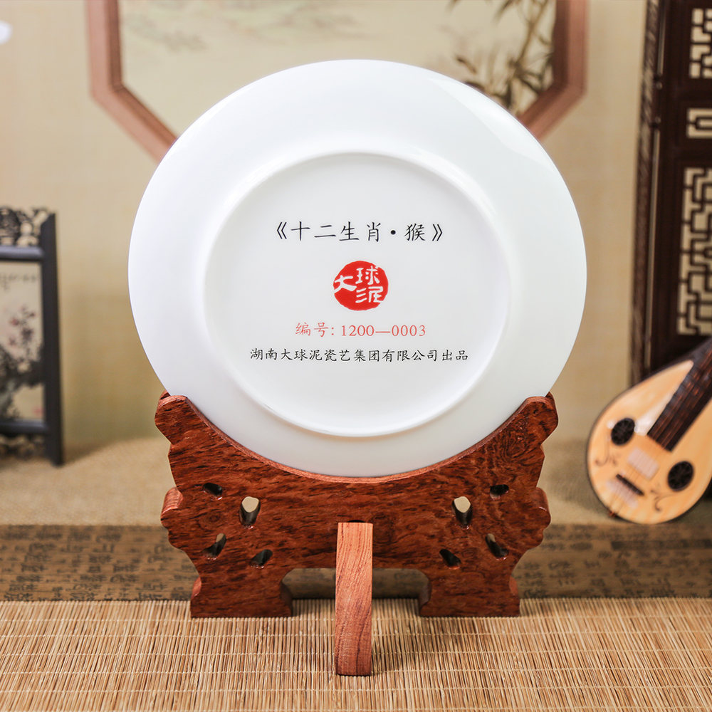 [品牌]:大球泥瓷 [材质]:大球泥 [工艺]:高温瓷雕 [规格]:直径20cm [作者]:石齐文 [产地]:湖南醴陵 [价格]:22000元 [设计]:滕召华(国家正高级工艺美术师) [品名]:《十二生肖·猴》浮雕瓷盘