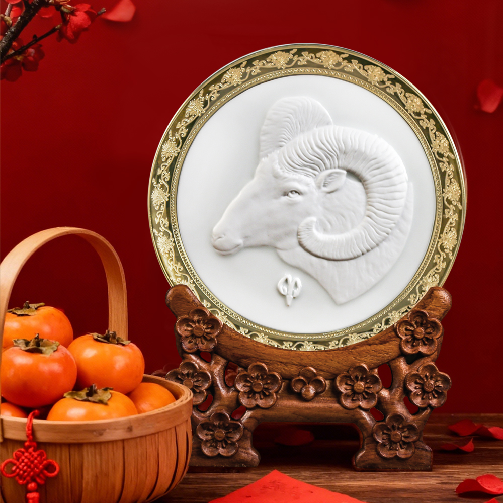 [品名]:《十二生肖·羊》浮雕瓷盘 [品牌]:大球泥瓷 [材质]:大球泥 [工艺]:高温瓷雕 [规格]:直径20cm [作者]:石齐文 [产地]:湖南醴陵 [价格]:22000元 [设计]:滕召华(国家正高级工艺美术师)