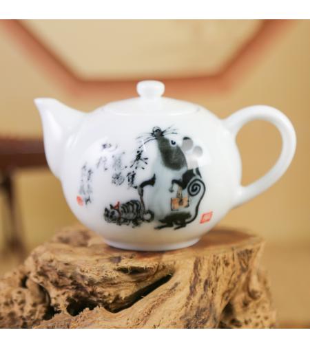 [品名]:《十二生肖.鼠》西施壶 [品牌]:大球泥瓷艺 [材质]:大球泥 [工艺]:高温釉下 [规格]:高7.5cm [作者]:黄永平 [产地]:中国醴陵 [价格]:20000.00元