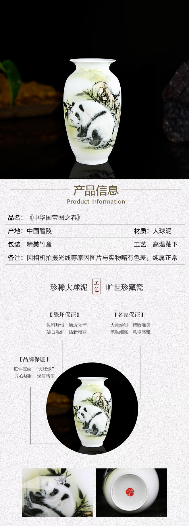 [品名]:《中华国宝图之春》 [品牌]:大球泥瓷 [货号]:DQN-P150036 [材质]:大球泥 [工艺]:高温釉下 [规格]:高19cm;肚径10cm [作者]:邓剑波(湖南省工艺美术大师) [产地]:中国醴陵 [价格]:70000.00元