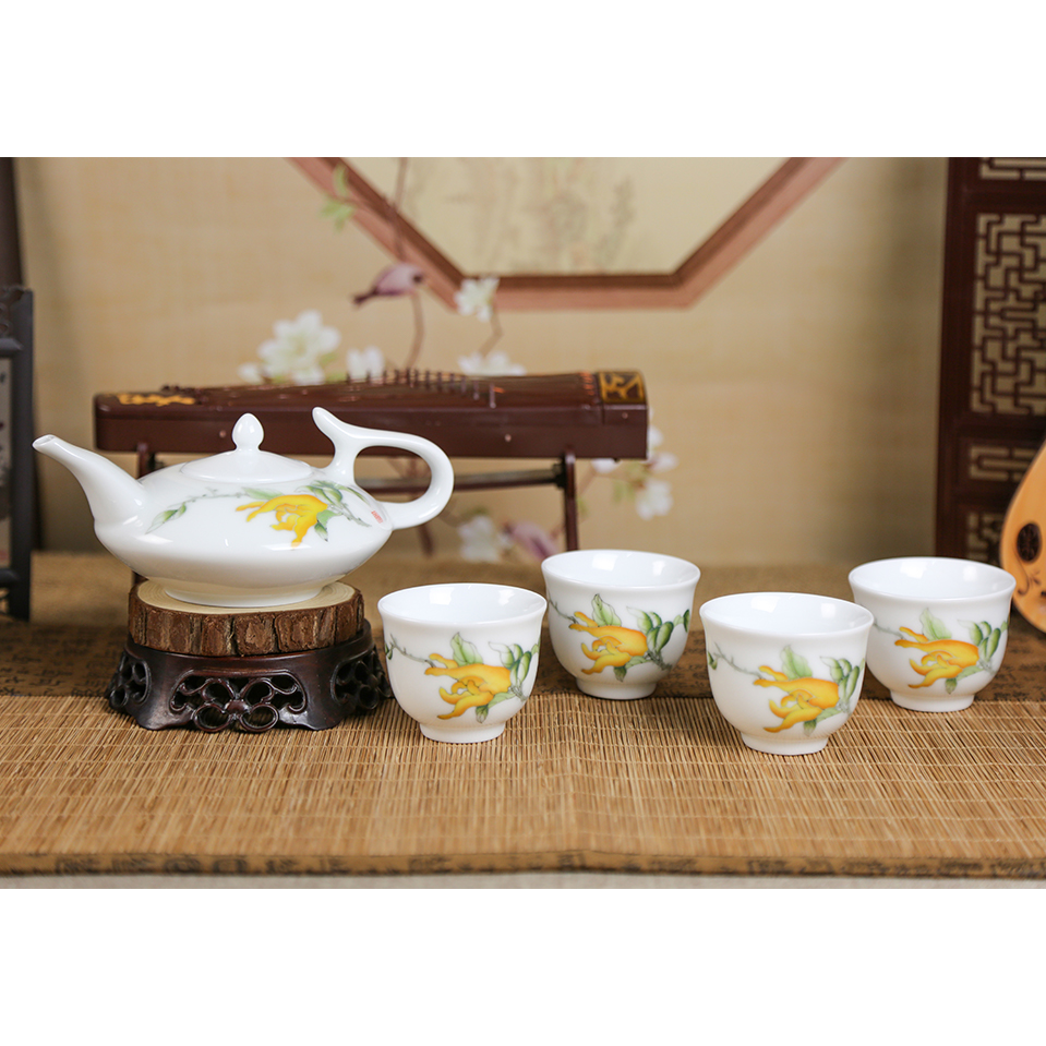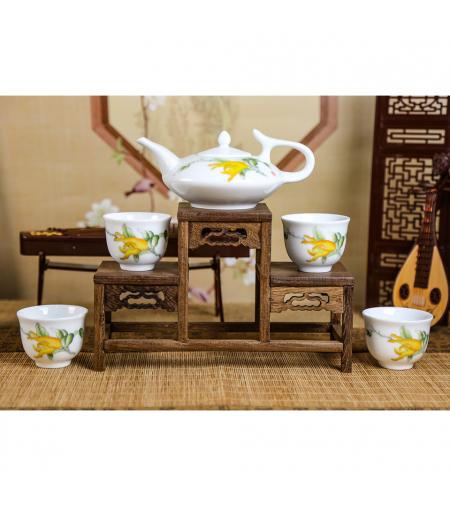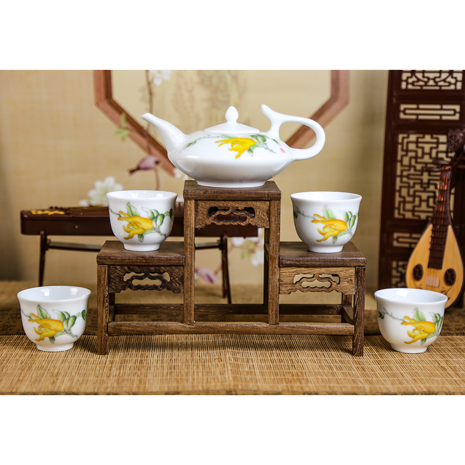 [品牌]:大球泥 [货号]:YZN-CJ230022 [材质]:优质泥 [规格]:5头 [作者]:张江华(高级工艺美术师) [产地]:湖南醴陵 [工艺]:高温釉下 [品名]:《福瑞》一壶四杯 [价格]:4200.00元