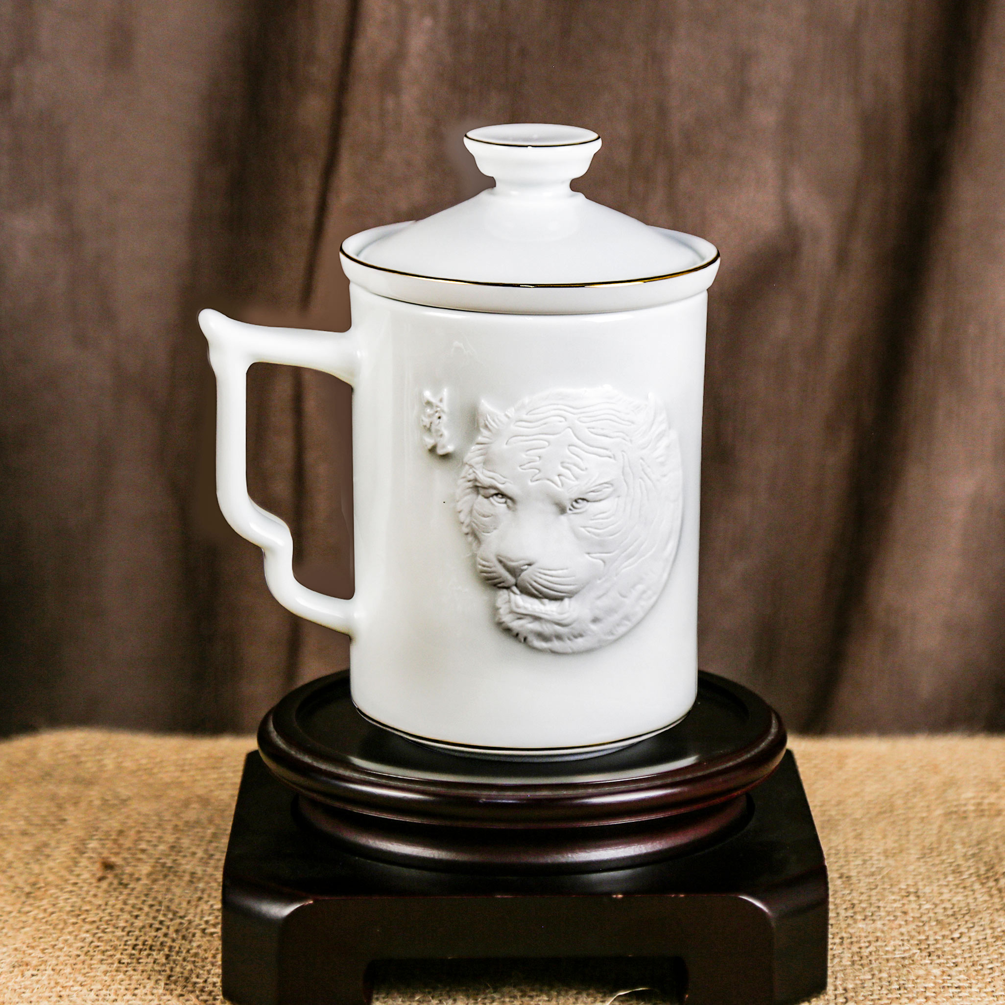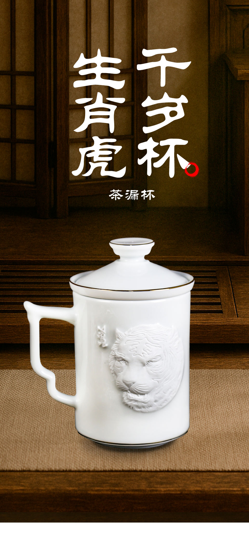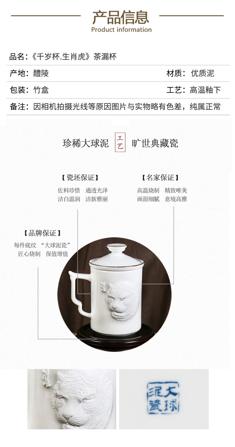 [品名]:《千岁杯.生肖虎》茶漏杯 [品牌]:地球泥 [货号]:YZN-CB250010 [材质]:优质泥 [工艺]:高温瓷雕 [规格]:3头 [作者]:大球泥瓷艺 [产地]:醴陵 [价格]:1000.00元