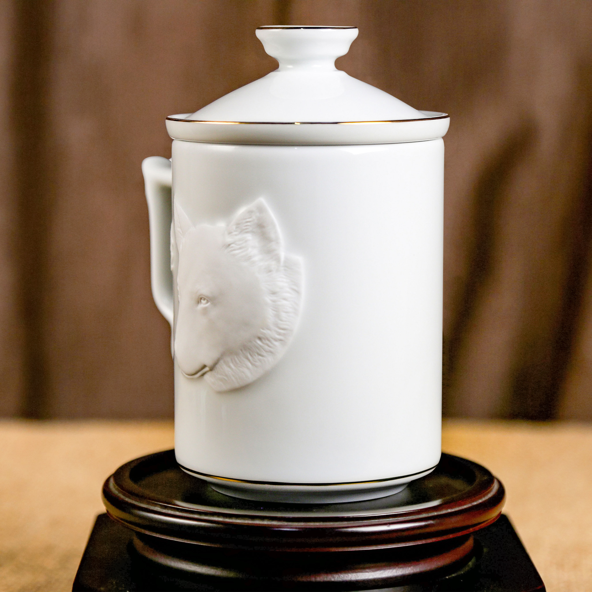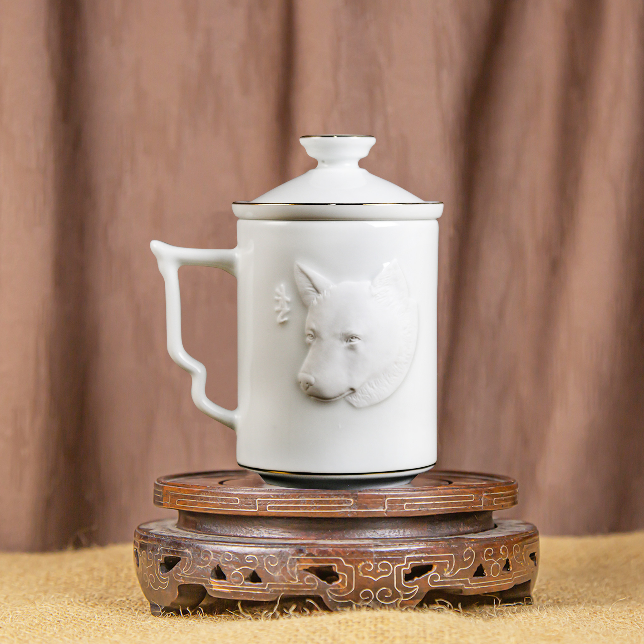 [品牌]:地球泥 [材质]:优质泥 [规格]:15.5cm [作者]:大球泥瓷艺 [产地]:醴陵 [价格]:1000.00元 [品名]:《千岁杯.生肖狗》茶漏杯 [货号]:YZN-CB250018 [工艺]:高温瓷雕