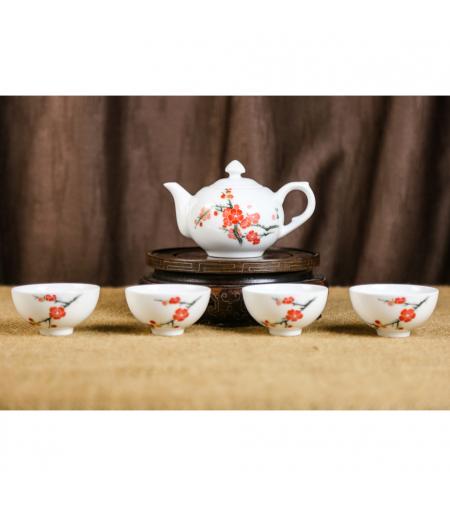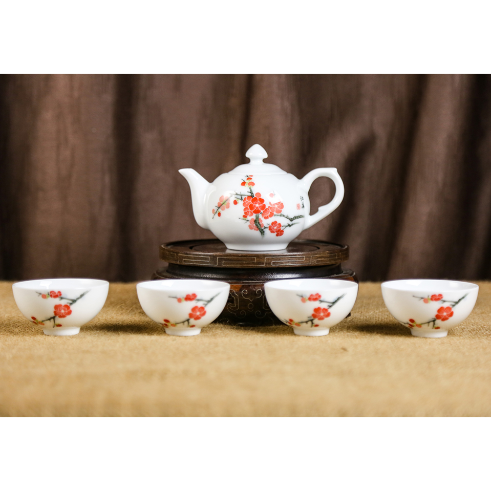 [品牌]:大球泥瓷 [货号]:YZN-CJ240015 [材质]:优质泥 [工艺]:高温釉下 [规格]:5头 [作者]:张江华 [产地]:中国醴陵 [价格]:3800 [品名]:《梅开五福》一壶四杯