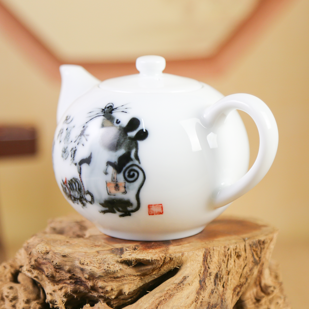 [品名]:《十二生肖.鼠》西施壶 [品牌]:大球泥瓷艺 [材质]:大球泥 [工艺]:高温釉下 [规格]:高7.5cm [作者]:黄永平 [产地]:中国醴陵 [价格]:20000.00元